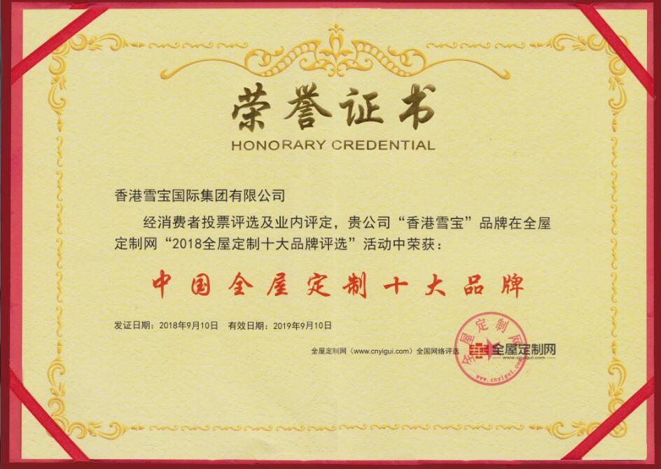 板材十大名牌雪寶定制榮獲“2018中國全屋定制十大品牌”