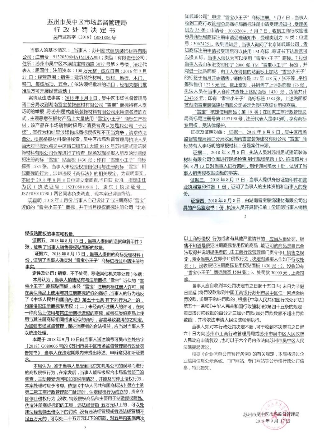 近期,雪寶公司接到舉報,發現在蘇州、連云港等地有建材商侵犯商標專用權的行為,雪寶公司立即向工商部門投訴。