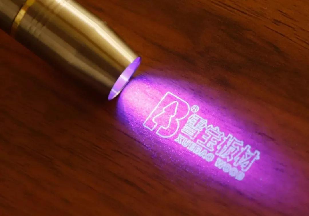 所有的雪寶板材上,都采用了這一防偽技術。識別的方法也很簡單:普通的紫光燈照射到我們雪寶板材的板面,即可顯示雪寶板材LOGO字樣,示例如下: