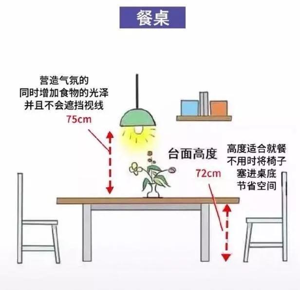 餐桌的高度一般在72厘米的高度,餐廳照明燈距離桌面75厘米的高度,最適合餐廳的范圍使用。