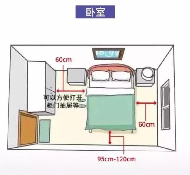 小戶型的臥室不帶衛生間,那么衣柜和床的距離不能小于60厘米,床到窗戶之間不小于60厘米。