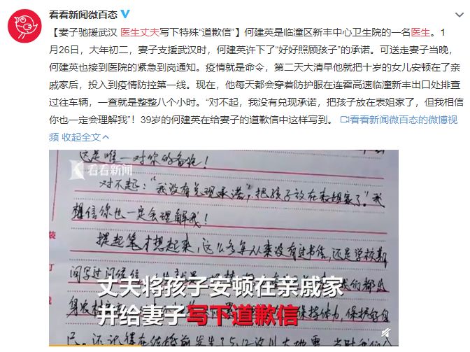 疫情爆發后,千千萬萬的醫護工作者志愿報名放棄節日休假,前赴一線戰疫。有的夫妻甚至先后雙雙投入一線工作,將自己年幼的孩子交給老人照顧,舍小家為大家,提交一線防疫的申請書,夫妻一起守衛群眾的健康……