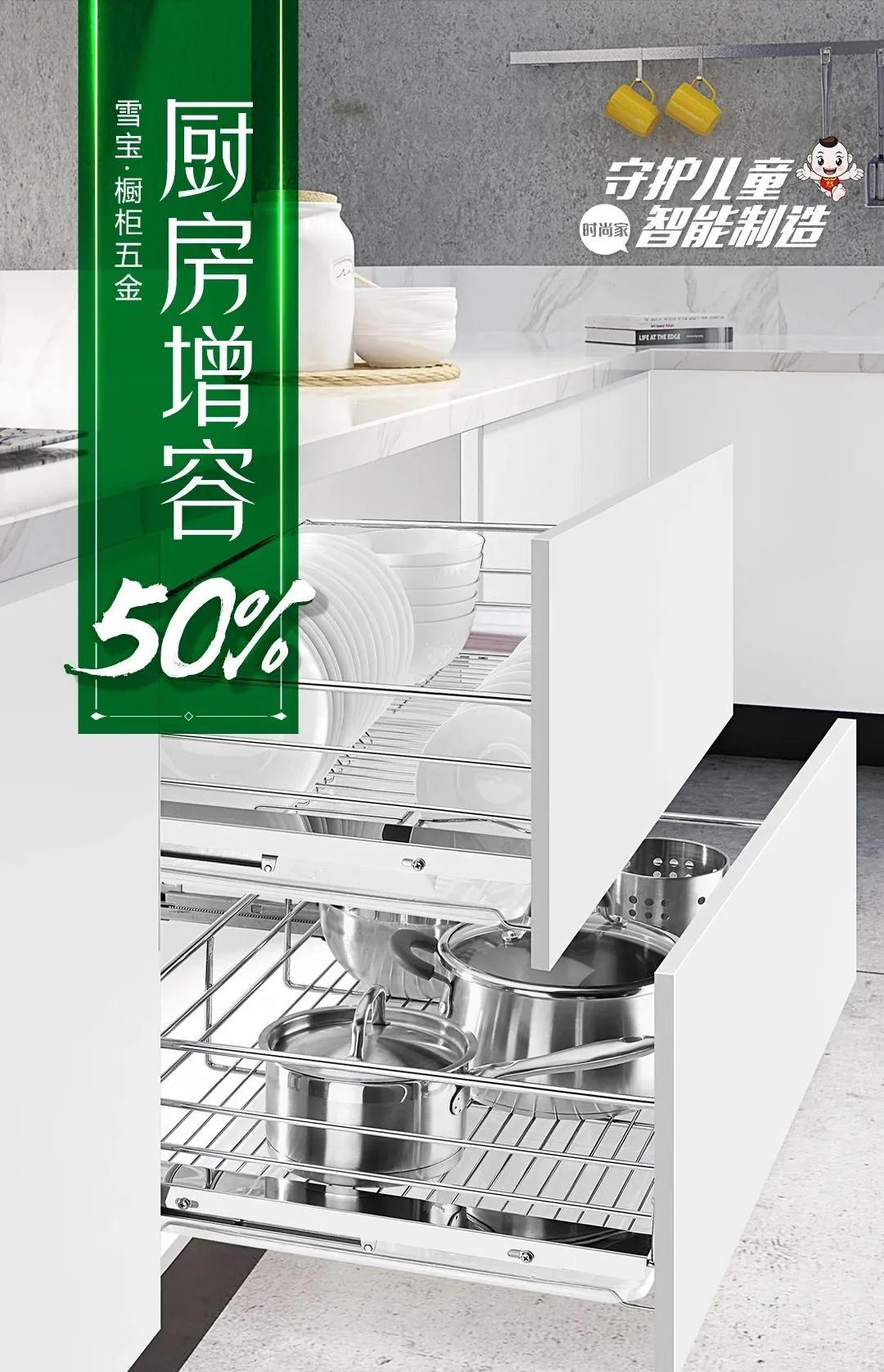 廚房的使用率算是非常頻繁的,許多有廚房裝修遺憾的業(yè)主,五金件沒選好是一部分原因,另外就是使用過程中收納糟心,大大降低了廚房的使用壽命。雪寶五金本次最新推出的幾款櫥柜五金產(chǎn)品,就是帶著走心的設(shè)計需求,為每一位精致生活的您帶來廚房增容神器,輕輕松松搞定廚房收納,讓廚房空間增容50%。