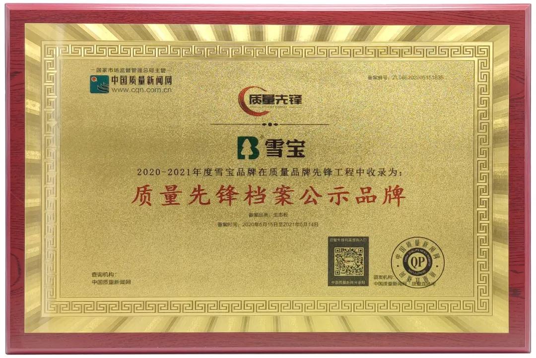注:質(zhì)量先鋒授予雪寶的“質(zhì)量先鋒檔案公示品牌”榮譽(yù)牌匾上蓋有中國(guó)質(zhì)量新聞網(wǎng)的官方標(biāo)印,同時(shí)印有備案品類、備案時(shí)間、證書(shū)編號(hào)、查詢網(wǎng)址及企業(yè)檔案專屬二維碼等信息。