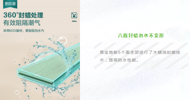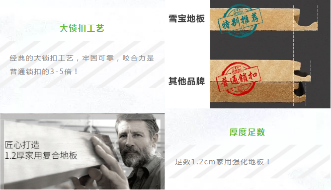 雪寶金剛面強化復合地板使用了木蠟油超級防水技術,地板厚度都是足數1.2cm,耐磨系數達到6000卷,從而大大的增加的強化復合地板的使用壽命。