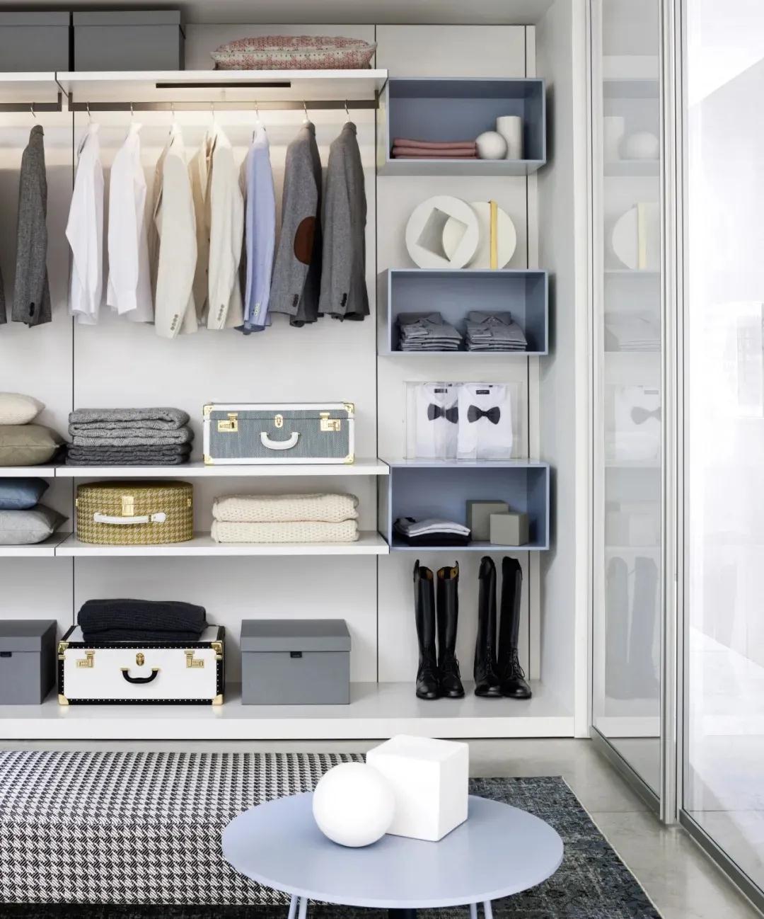 屋內的拐角處也可以設置迷你衣帽間,嫌衣物亂想遮擋的話,可以設計玻璃柜門,防塵又美觀。