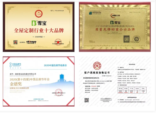作為健康家居生活守護者,雪寶載譽而歸,相繼榮膺2020中國板材影響力品牌、中國質量先鋒檔案公示品牌、中國板材國家品牌、定制家具行業創新品牌、2020年度板材行業十大品牌、2020年度全屋定制行業十大品牌、匠心工藝獎、消費者喜愛品牌、客戶滿意度五星證書等榮譽稱號。