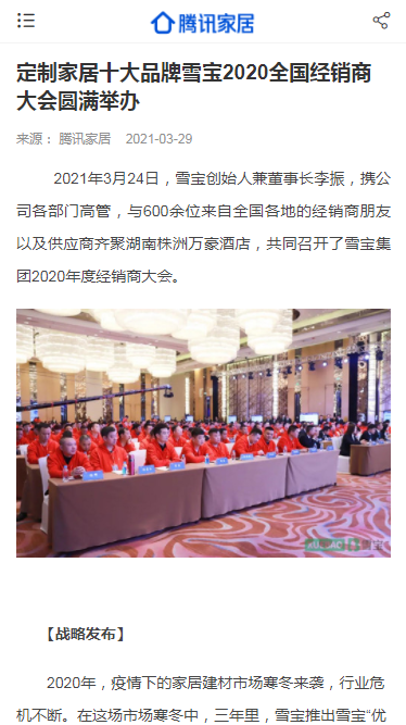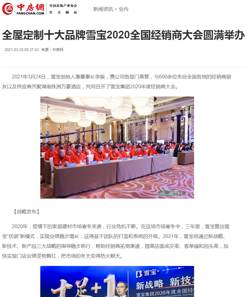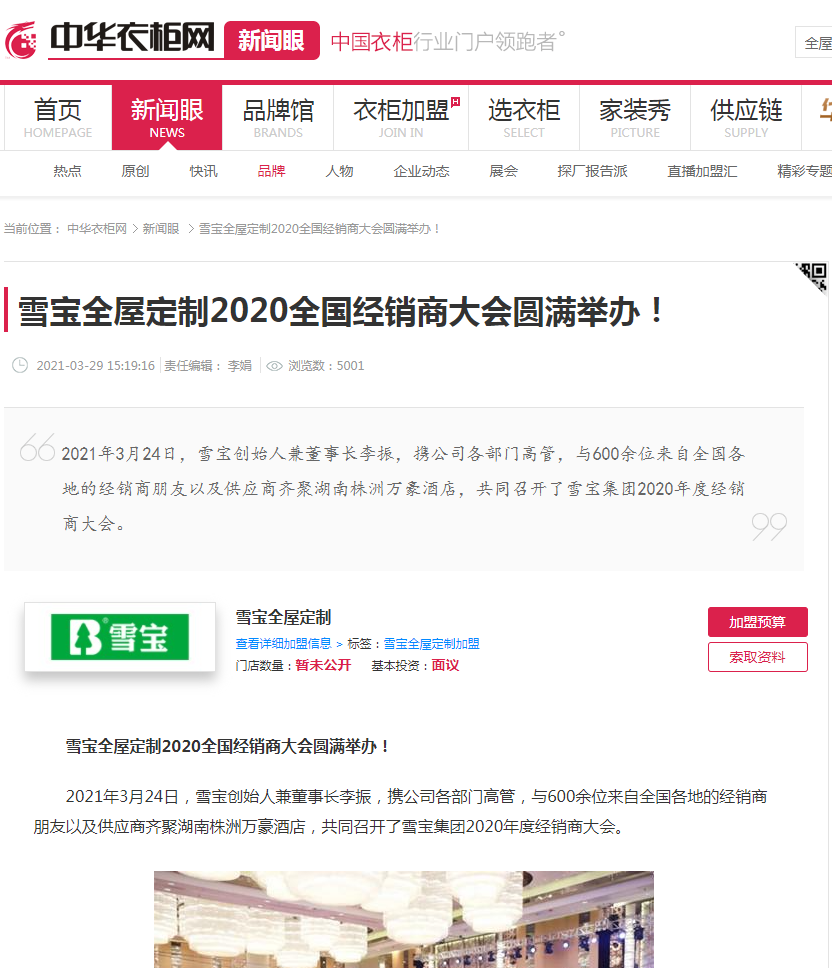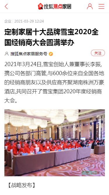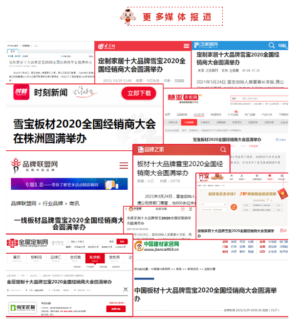 今日頭條、百度、360、新浪家居、搜狐焦點、網易家居、騰訊家居、中國保護消費者基金會、中國質量新聞網、中國木材與木制品流通協會、中國質量萬里行、中國建材網、慧亞網、一兜糖、小紅書、慧聰網、中華衣柜網、央廣網、太平洋家居網、品牌網、齊家、全屋定制網、中國木業網、紅網等等上百家行業主流、權威媒體爭相關注,開啟專題報道,將雪寶2020年度經銷商年會盛典線上曝光度推向高潮。