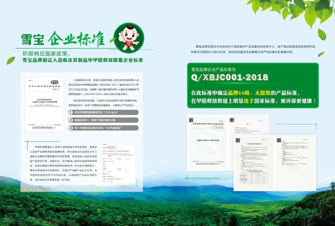 聯合權威機構制定雪寶企業產品標準:Q/XBJC001-2018;在此標準中確定品牌E0級、無醛級的產品標準,在甲醛釋放數值上明顯優于國家標準,更環保更健康!