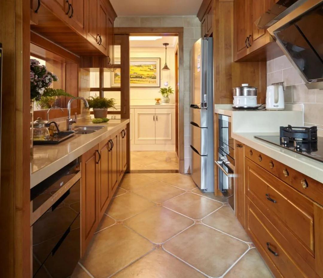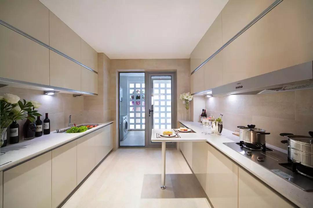 也叫雙一字型廚房,是最高效的廚房布局,最大化分配廚具和操作臺的空間,廚房長而窄,兩側(cè)都有空間,在走廊一側(cè)空間足夠的話,還可以設(shè)計一個溫馨小餐廳。