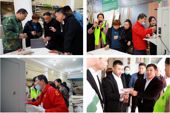雪寶優(yōu)裝基于“前店后廠”模式,擁有自己的小型加工廠,標配開料機、封邊機以及其他加工設(shè)備。參會經(jīng)銷商在雪寶優(yōu)裝平江店加工廠參觀學習,現(xiàn)場觀摩工人進行“二合一工藝”安裝實操及其他生產(chǎn)加工工序。
