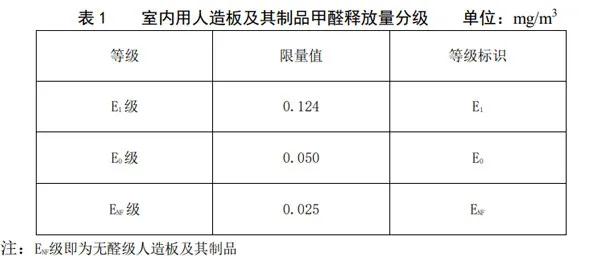 ★ 該標準將室內用人造板及其制品的甲醛釋放量按照限量值分為3個等級,即E1級(≤0.124mg/m³)、E0級(≤0.050mg/m³)和ENF級(≤0.025mg/m³)。