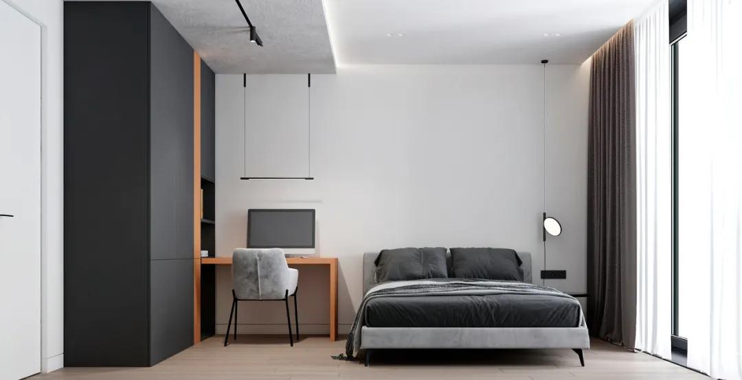 臥室作為休息的空間,是一個需要絕對安全感的地方。黑、白、灰的經典配色所帶來的,那份簡單而純粹的質感,會讓空間更易營造舒眠氛圍。