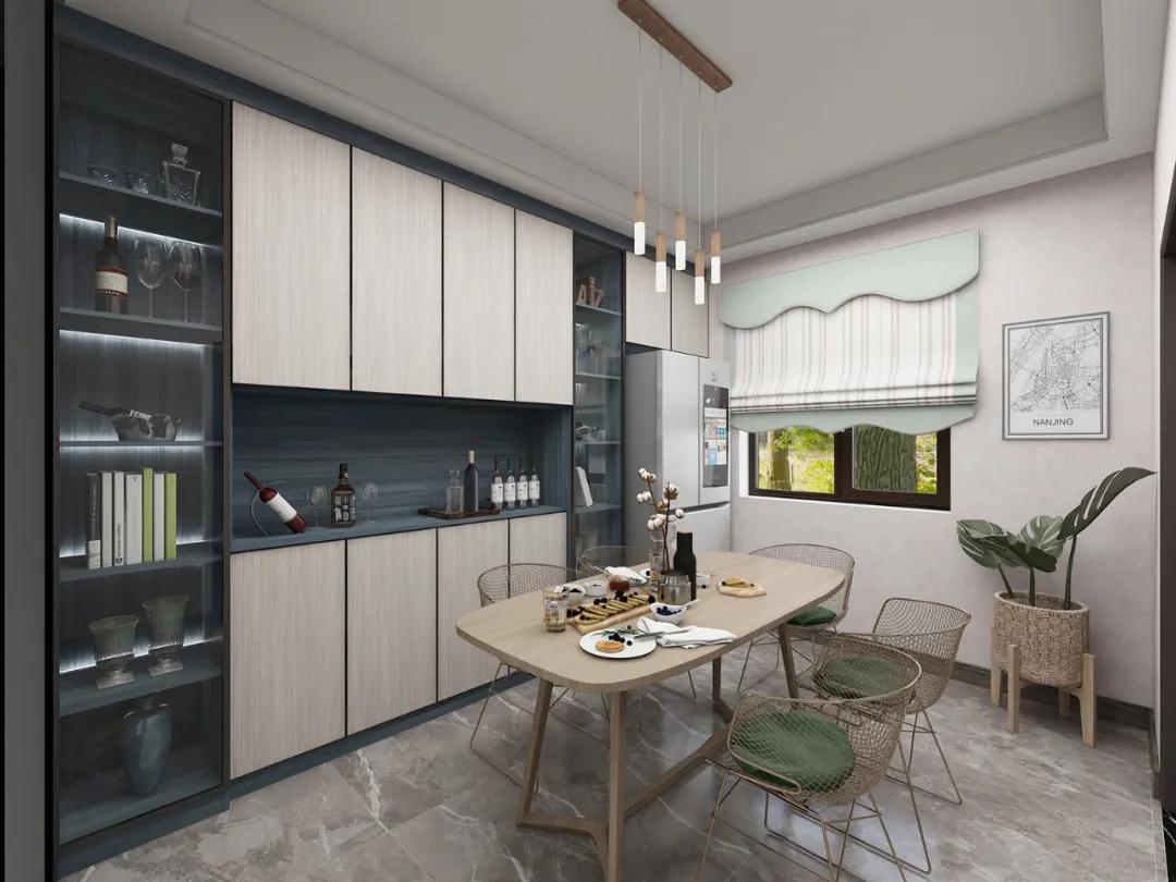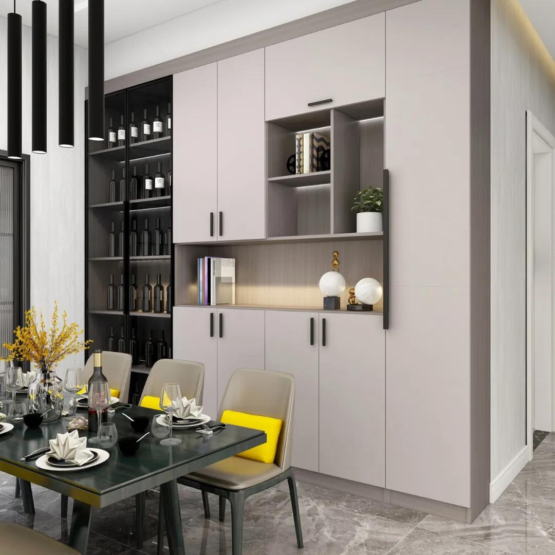 隨著現代生活理念的變化,輕奢元素進入更多年輕一代的生活,能更好的襯托出餐廳的格調。定制餐邊柜將墻面最大程度地利用,一柜到頂,合理劃分區域,做到餐具收納+展示柜+酒柜的多功能結合,是最佳的呈現。