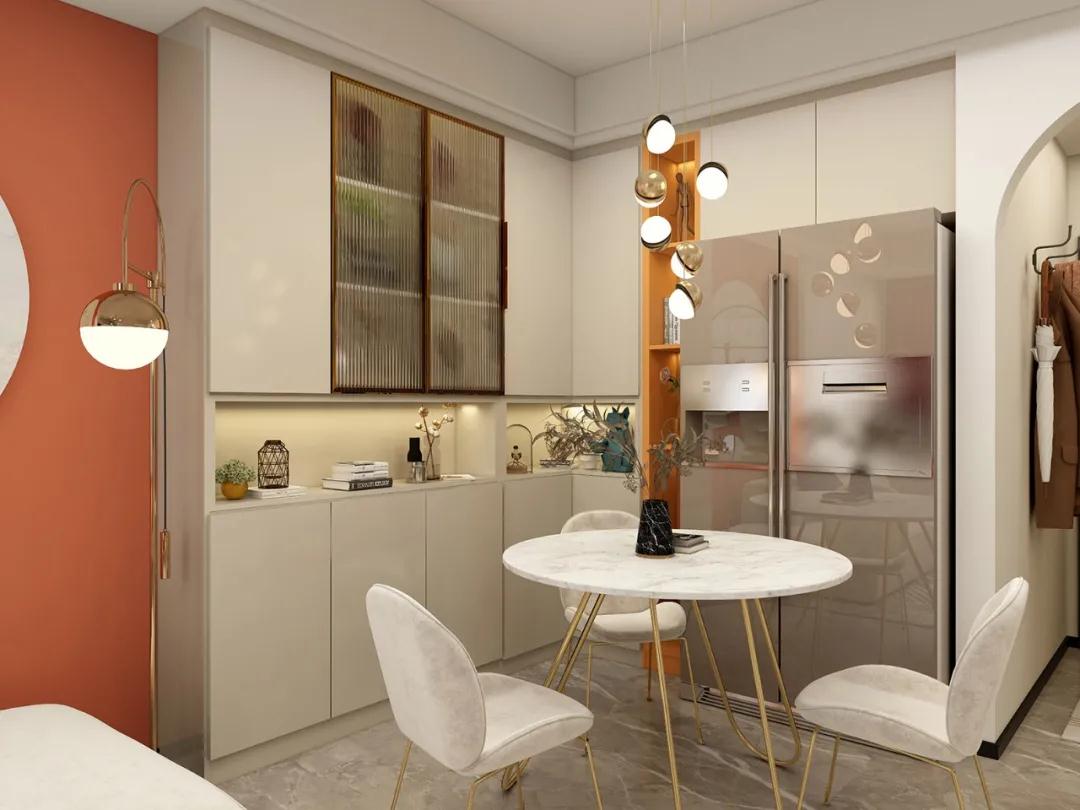 玻璃材質展示出夢幻、晶瑩的效果,配合柔和的輔助燈光,更添氛圍感,輕奢氣質呼之欲出。結合主人的喜好,擺放上收藏品、紅酒、綠植、畫作,讓用餐區域增添情調,倍添姿色。
