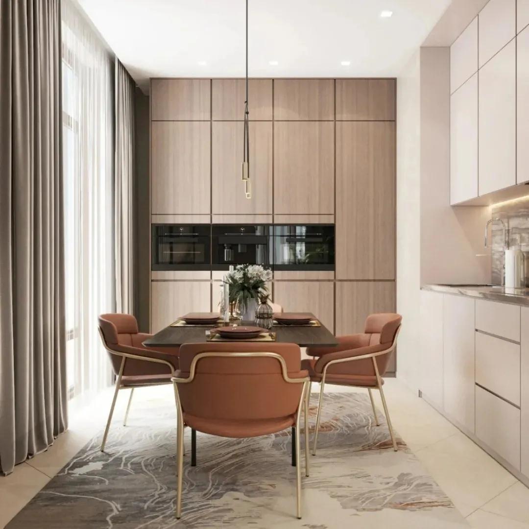 顏色上可選淺色系,帶來更開闊的視覺感受。或者選擇與周圍軟裝相近的深色系,配合精致的燈具造型。或在餐邊柜局部運用出挑的顏色,制造視覺上的反差效果,強調存在,帶來鮮明的觀感。