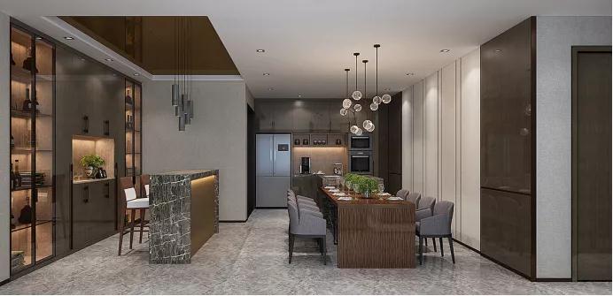 金屬酒柜充滿了輕奢氣韻,酒柜陳列錯(cuò)落有致,精致在一瞬間充分體現(xiàn)。木材、金屬、玻璃的碰撞,別具一格!餐邊柜采用通透的黑色窄框玻璃門搭配,虛實(shí)結(jié)合,提升餐廳氣質(zhì)。