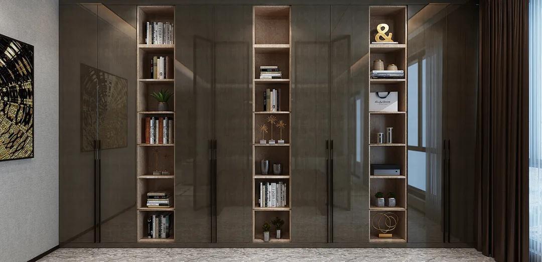 臥室衣柜在設(shè)計(jì)中同樣運(yùn)用了黑框玻璃門與高光門的結(jié)合,直線條的設(shè)計(jì)貫穿于整個(gè)空間,營造出一個(gè)時(shí)尚雅致且靈動(dòng)的空間氛圍。
