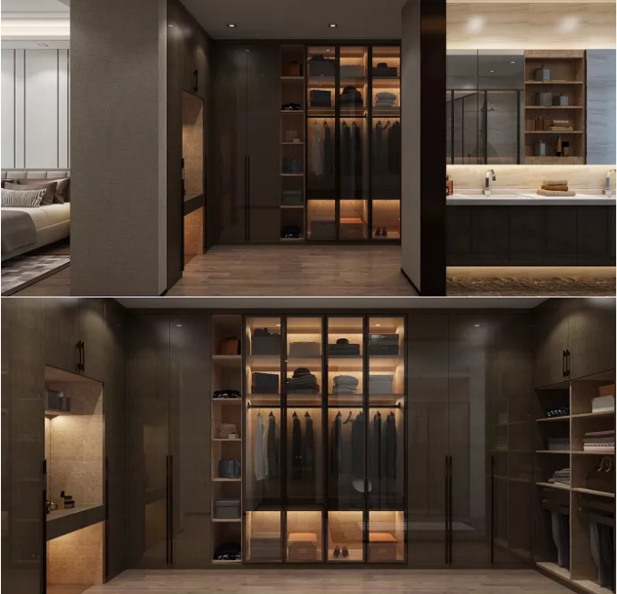 生活不止于當(dāng)下,在節(jié)奏匆忙的生活里,“輕奢”屬于他們的生活態(tài)度。衣帽間在設(shè)計(jì)上跟全屋統(tǒng)一元素,衣柜中間設(shè)計(jì)梳妝區(qū)域,玻璃門里面柜子安裝了層板燈和開放格組合,讓整個(gè)空間更富有層次感。