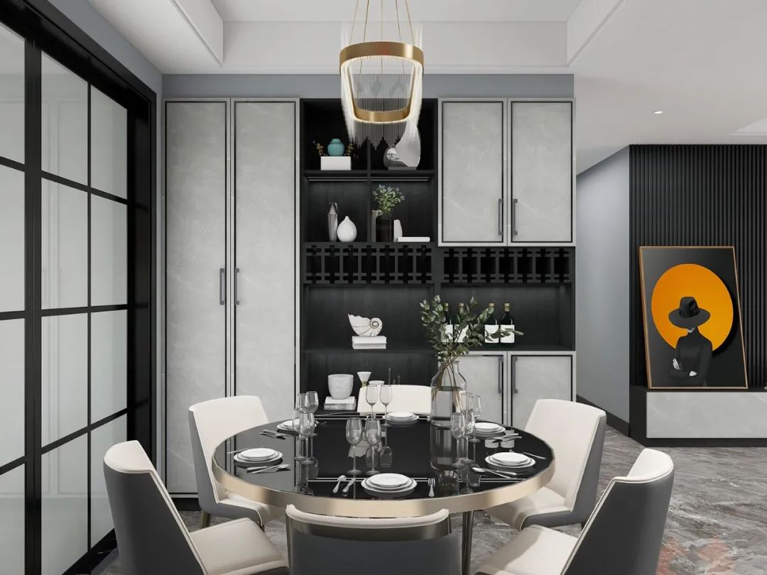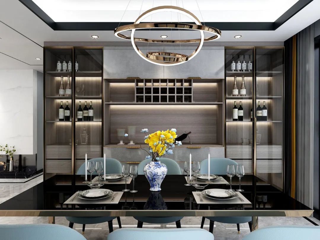 整墻而立的酒柜,收納“一柜”搞定,加入金屬鋁框玻璃門,增添設(shè)計(jì)感,獨(dú)具品位,視覺上更為通透。