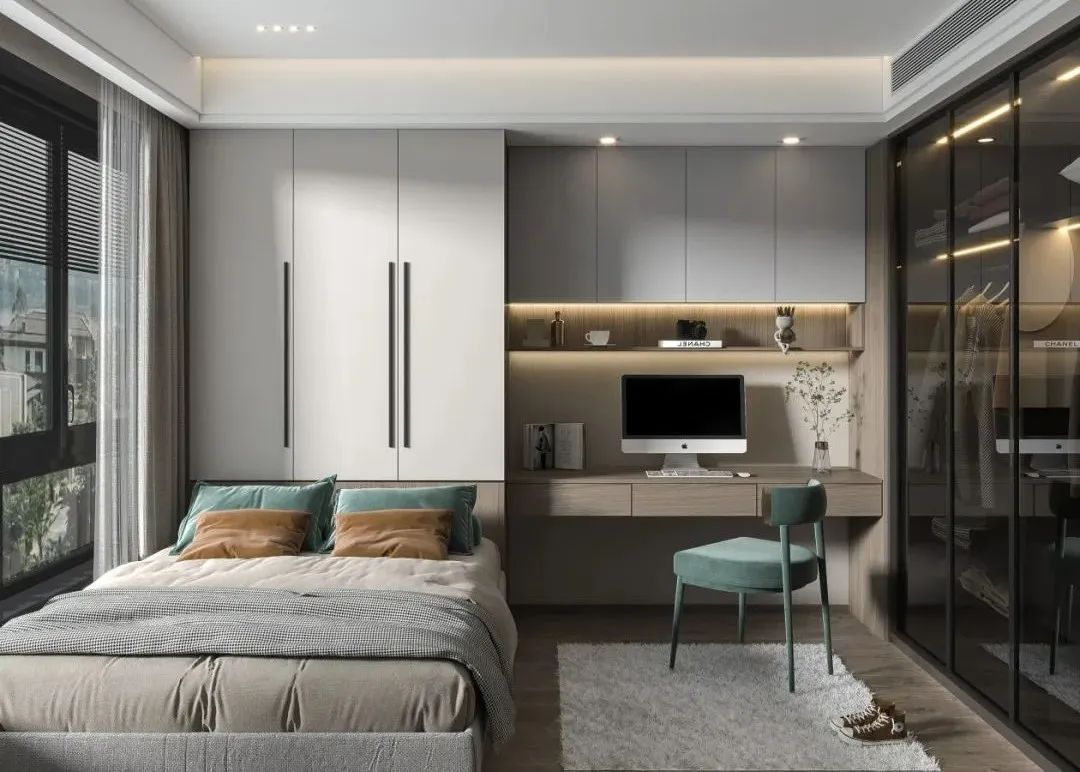 當然,現在還有一種比較尷尬的戶型,那就是臥室門跟電視背景墻在同一側的情況。這時候可以利用柜門與柜體同色系的做法,打造出一款隱形門,既不會影響視覺觀感,還能夠減去敲砌墻的麻煩。
