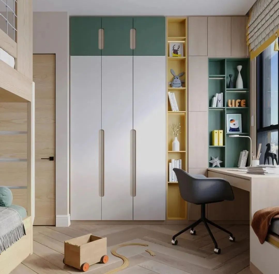 既然是書房,那書柜當然是必備的了。這種占據整面墻的大書柜是大多數書房的標配,如果再設計隔層,增加抽屜、小黑板等,實用性提升就不止一個檔次了。
