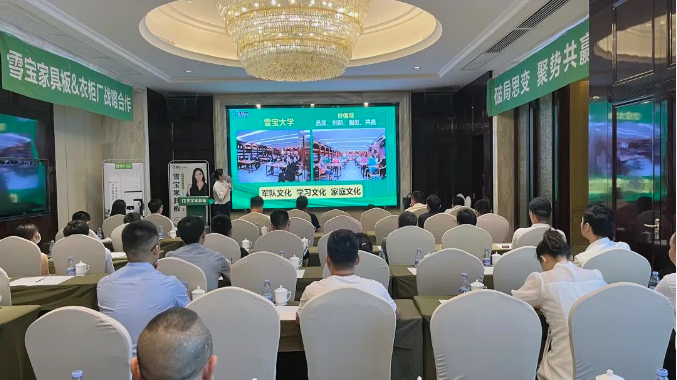 會上,雪寶人才戰略與傳播中心謝老師為蒞會來賓詳細講解“品牌雪寶”以及“雪寶納米康晶柜門板產品”,幫助各位合作伙伴全方位了解品牌實力以及主流門板產品的獨特優勢。
