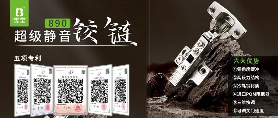 雪寶超級靜音鉸鏈系列產品匠心鑄造,采用國際領先的工藝技術,超強防銹、靜音緩沖、安裝便捷等能力經得起種種考驗,無論在油煙聚集的廚房,還是潮濕通風不佳的洗手間,依然保持光亮如新,輕柔無聲,開合自如!此次雪寶890超級靜音鉸鏈升級研發,具備零角度緩沖、兩段力結構、冷軋鋼材質、進口POM阻尼器、三維快調、可調關門速度6大優勢,并且這是一款已經獲得1個國家發明專利、3個實用新型專利、1個外觀專利的超級靜音鉸鏈!