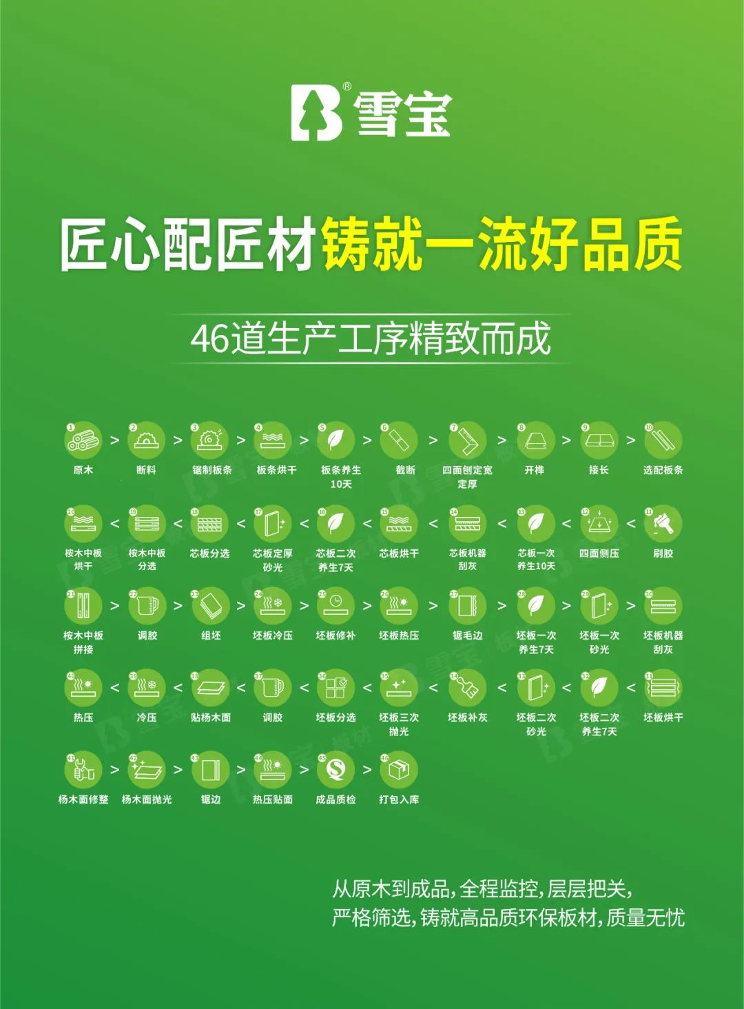 從甄選更優質的實木原材以確保基材更優異,到建立嚴苛的生產工藝標準以保障品質更卓越,以及添加無醛的環保植物大豆膠黏合,雪寶從根本上杜絕甲醛、苯酚等有毒和有害物質的釋放。