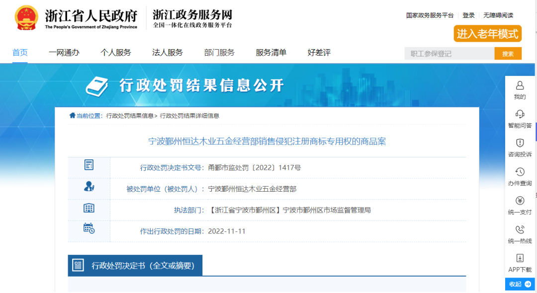 寧波市鄞州區市場監督管理局從案件的初步核查、立案到調查取證等各個環節,均發現侵權人存在違法違規行為;在該局的高度重視、秉公執法、重拳出擊下,寧波鄞州恒達木業五金經營部最終得到了相應的行政處罰決定。
