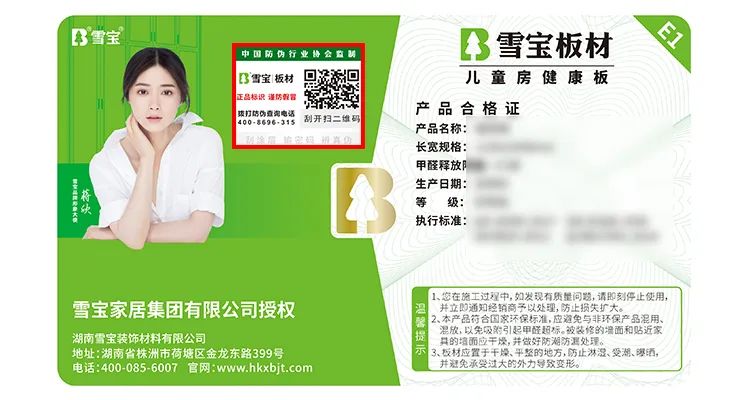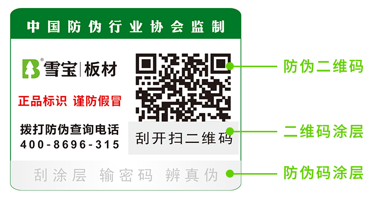 正品雪寶板材上,都貼有一張合格證。這張專屬的“身份證”,合格證上有專屬防偽碼。防偽碼可以查詢產品防偽的相關信息。