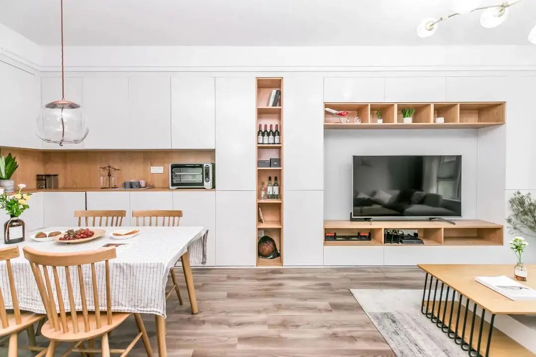 電視柜+餐邊柜整墻定制,這種設計適用于一體式的客餐廳,不僅能提升客餐廳的儲物能力,還能拉長客廳視覺,讓小空間更顯大。