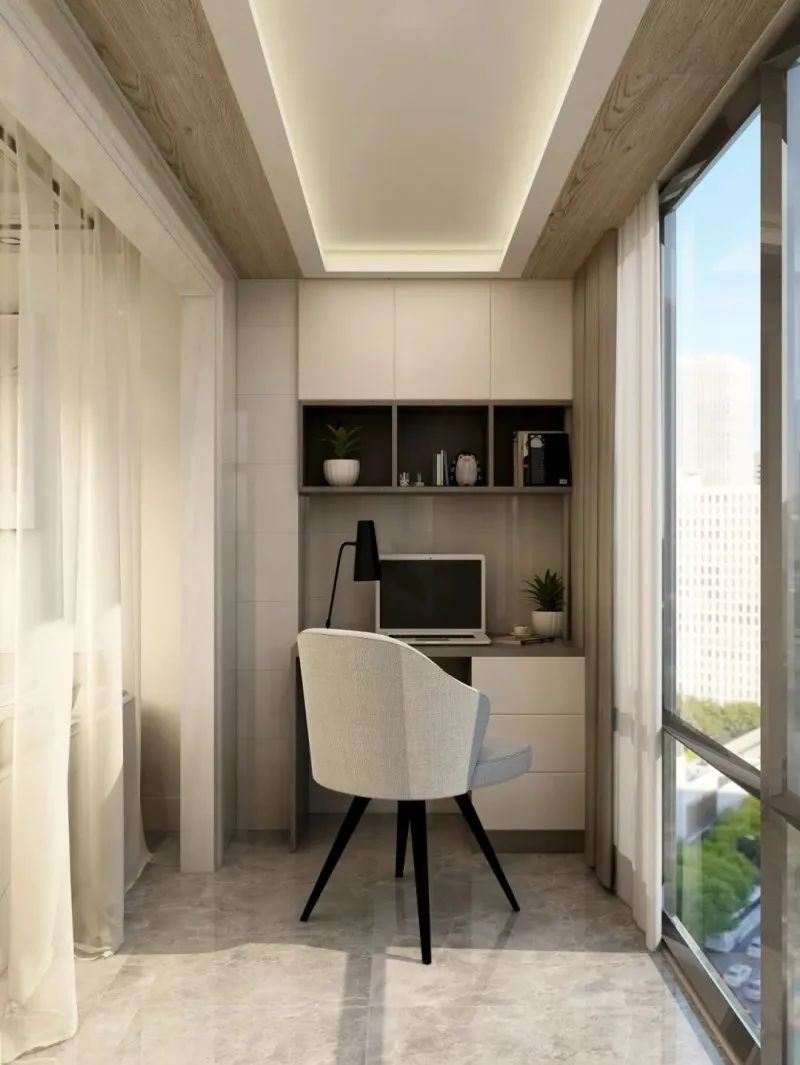 陽臺柜設計得好,可以為陽臺增色不少。陽臺上部分做到頂半開放式吊柜,用來收納和展示。下方做書桌臺面,就能成為一個獨立的辦公區。陽臺視野寬闊,工作閑暇舉目遠眺,還可放松身心。