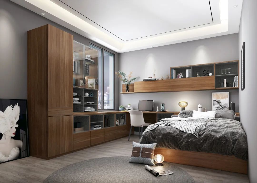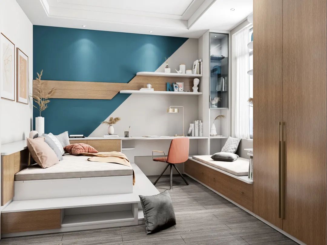 這種“功能三合一”的設計被廣泛運用在兒童房或多功能房,它可以同時滿足休息、學習和收納需求,實用且美觀。這種“柜+桌+床”的設計,不僅有舒適的工作區,儲物收納+休閑會客+臨時客臥,一次滿足四大需求。