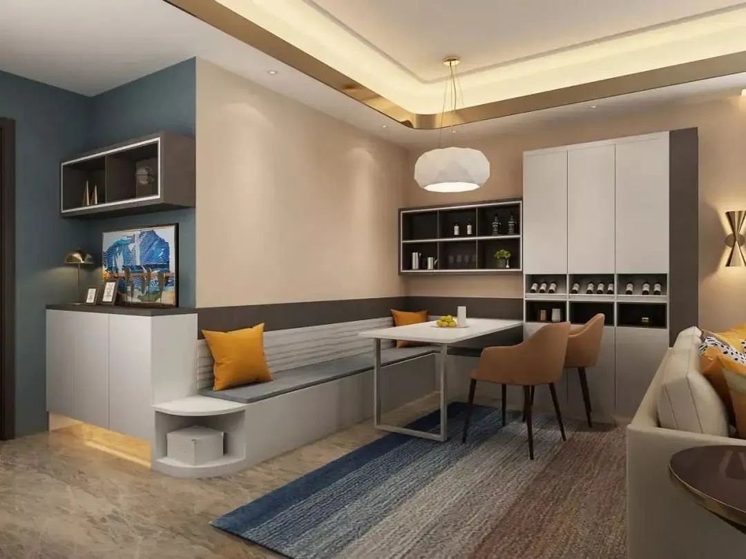 如果餐廳空間比較小的話,還可以在這里貼墻定制卡座來代替餐椅,不僅節約了椅子的占位,卡座還能用來儲物,進一步提高了空間利用率。