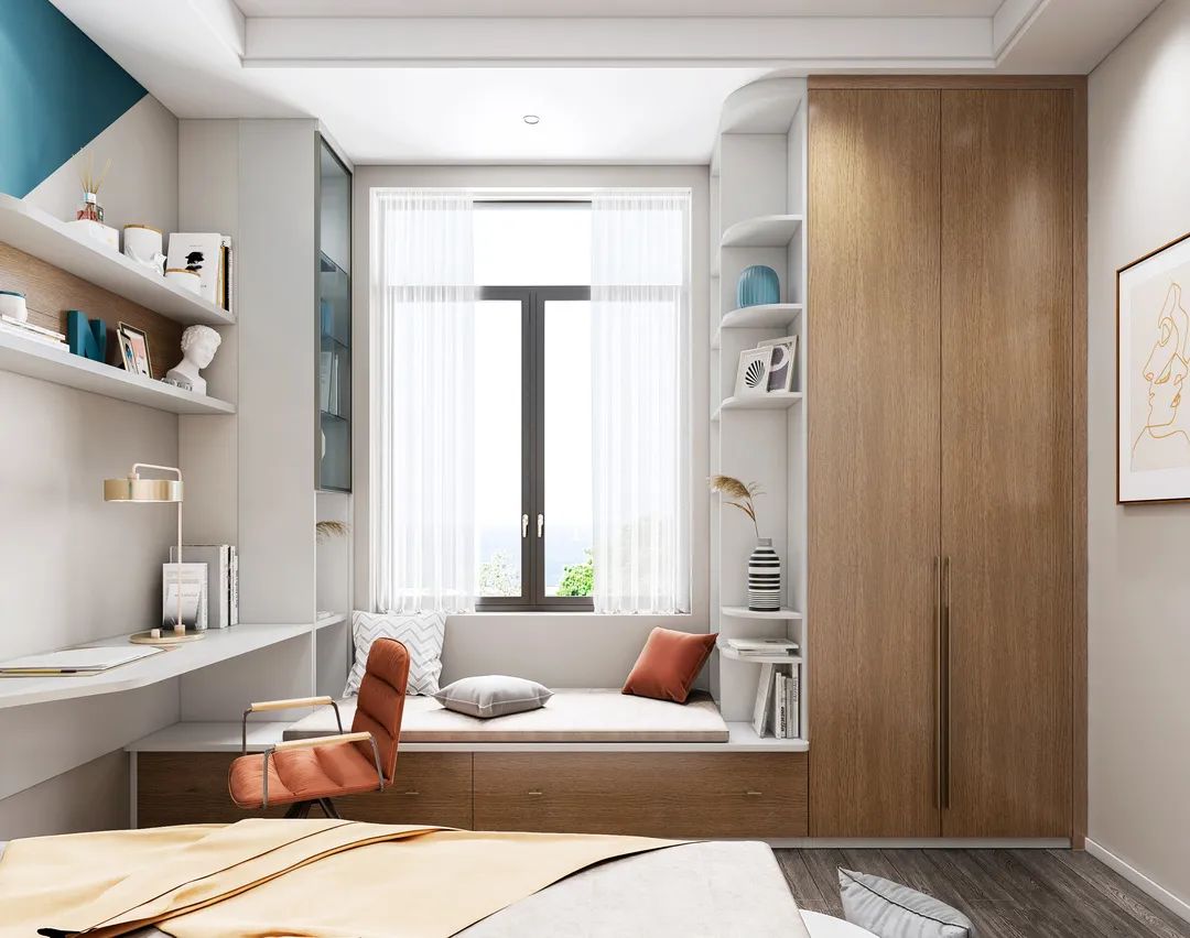 靠窗定制飄窗柜,擴大儲物空間,上鋪軟墊,可以坐躺在上面休息,放松身心;靠飄窗柜定制書柜和書桌,又成為了一個學習辦公區,沒有獨立書房的家庭,就能把這里當開放式書房了哦~