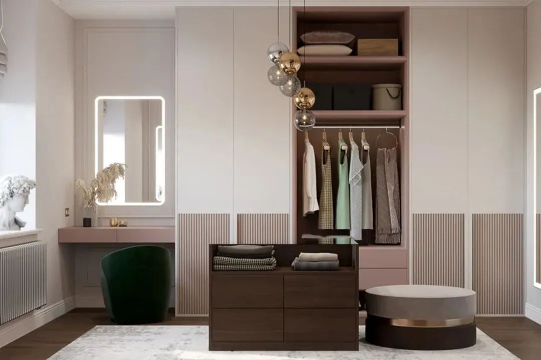 當然,除了延展出來,也可以直接把梳妝臺“裝”在衣柜里,做衣柜時提前設計好在某一處空出一個空間,定制一個置物格,安裝抽屜,充當梳妝臺面,不僅整體性強,也更節省空間。
