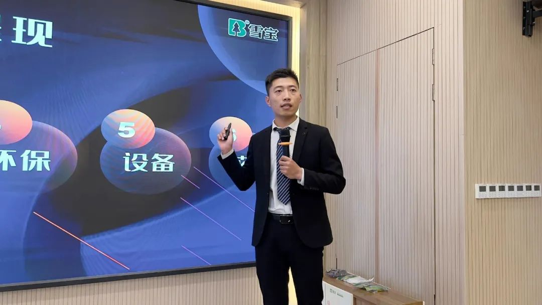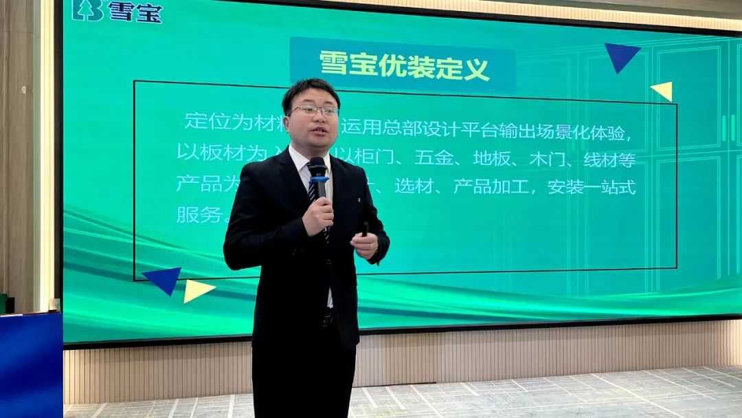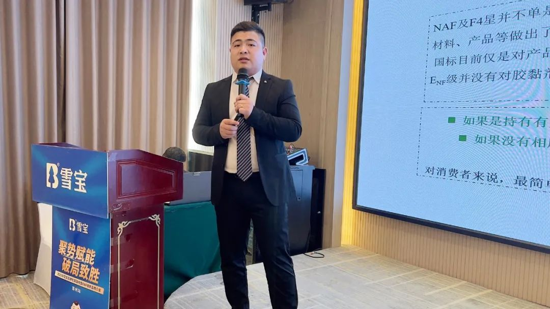雪寶華北營銷中心生態(tài)板事業(yè)部河南省區(qū)經(jīng)理劉強(qiáng)就“雪寶ENF級(jí)環(huán)保板材新品發(fā)布”展開課程講解。