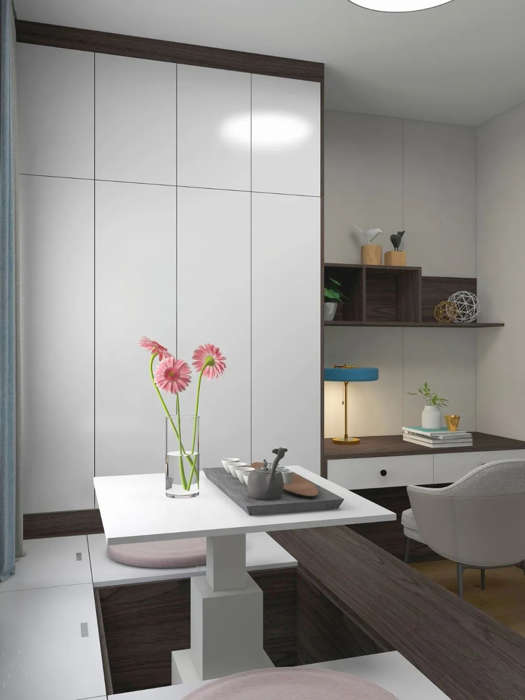 如果空間足夠,還可以配置升降桌,讓空間更具有生活品味。放上一些軟墊和抱枕,以及綠植,打造專屬的休閑活動區域,享受寫意生活。