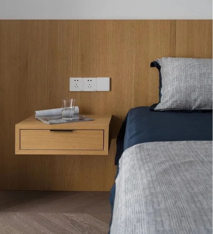 如果你想床頭旁邊的位置更加簡潔一點,可以考慮采用隔板的形式,這種設計非常簡潔。