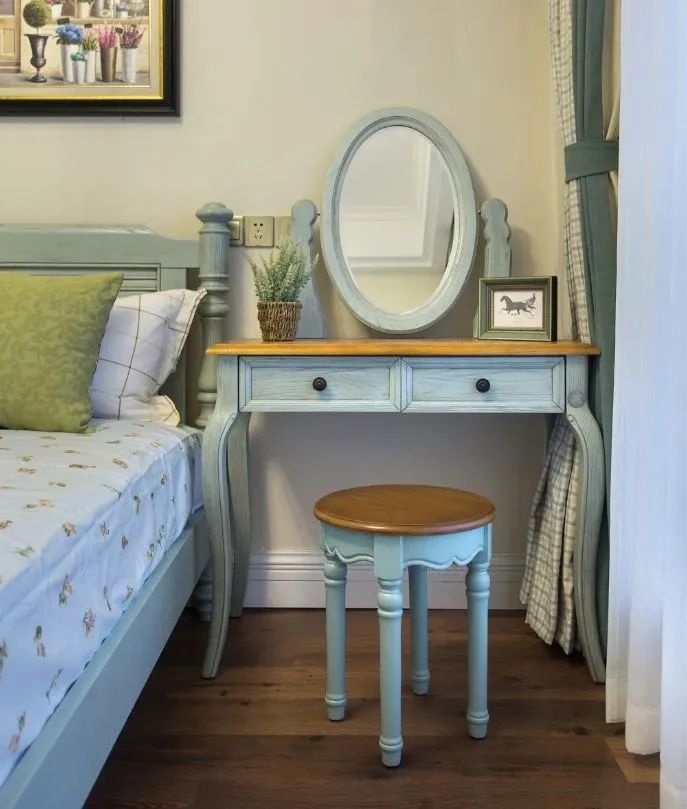 床頭柜的位置如果足夠寬敞的話,還可以考慮擺放一張梳妝臺,這樣又可以起到床頭柜的作用,同時又滿足日常梳妝打扮的需求。