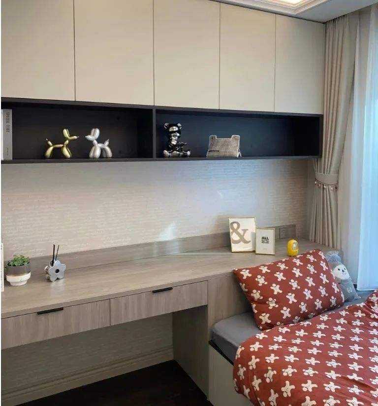 臥室安靜隱蔽,十分適合辦公或者寫作業。床頭柜+書桌一體化后,不僅可以收納物品,還打造了一個學習區域,讓臥室空間實現一房兩用。兩者重合會自然呈現一個高度差,提升空間的功能性的同時,增加了臥室的靈動性。