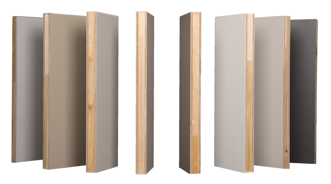 板芯精選規格統一的一級實木香杉方料齒接而成,首先貼第一層桉木養生一周并雙面精度砂光,再貼合第二層桉木再養生一周后,再一次進行雙面等厚精度砂光處理,保證正誤差范圍20絲以內,然后做雙面橫拉科技木皮,確保板材平衡穩定無變形,后貼楊木大皮保證板材表面平整光滑,最后貼雙面同色三聚氰胺紙后做PETG貼合。