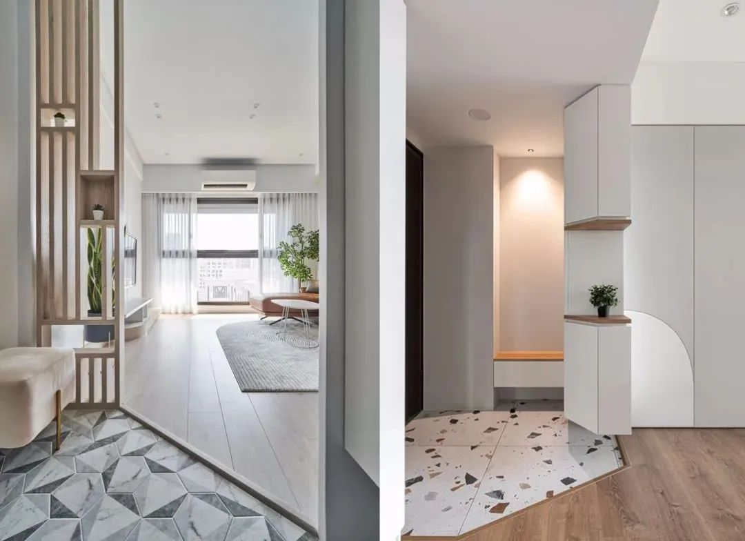 如果玄關(guān)客廳通鋪瓷磚那就比較好處理,如果客廳想鋪木地板的話,玄關(guān)地面可以選用瓷磚來進(jìn)行一個(gè)空間分隔,這樣不僅有高顏值,還能方便清潔劃分區(qū)域。
