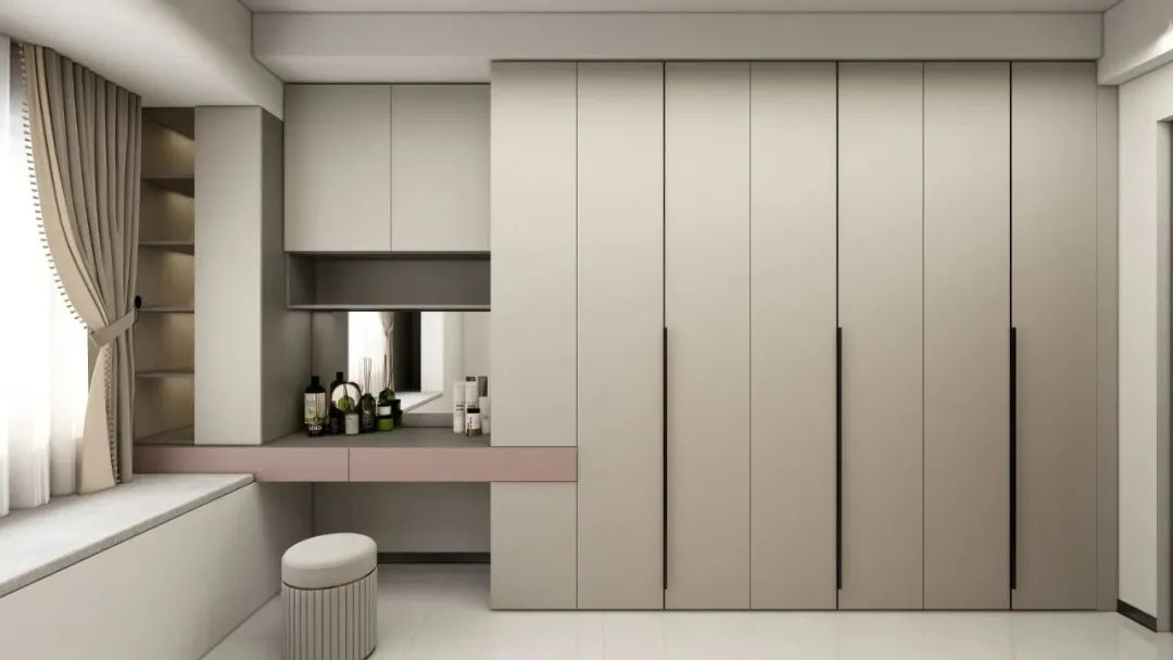 將梳妝臺搬進臥室,優化生活動線,豐富居室功能。為了整體性更強,梳妝臺可以與衣柜組合定制,一體化設計既不突兀也不會讓整個空間太過單調,兩全其美。