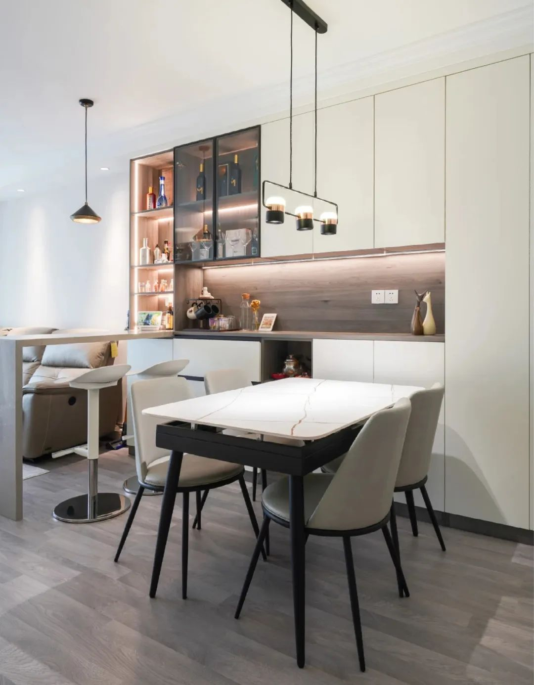 緊湊的小戶型不方便擺放餐椅的話,餐邊柜可以整合餐桌、卡座功能,為過道節(jié)省空間,一柜多用,極致享受。