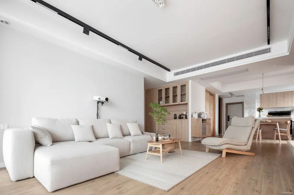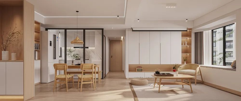 日式原木風一般以白色和木色為主色調,整體簡單、實用、低調。為了使視覺空間更大,通常會將客廳和餐廳結合在一起,并利用收納與裝飾兼具的小型餐邊柜巧妙過渡。簡單的橫豎線條,不多加繁瑣的裝飾,隨意的地毯、茶幾,一植一器,加上點狀光源的設計,都將日式禪味的風格展現得淋漓盡致。