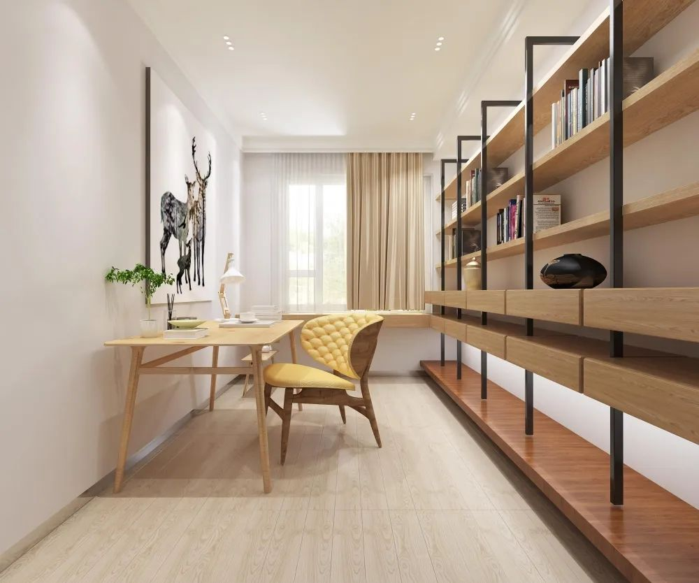 原木色的書房形成了樸素的自然風格。質樸的原木貫穿全屋,可用低飽和度的白色和綠植進行點綴空間,顏色由深到淺,層次感十足。