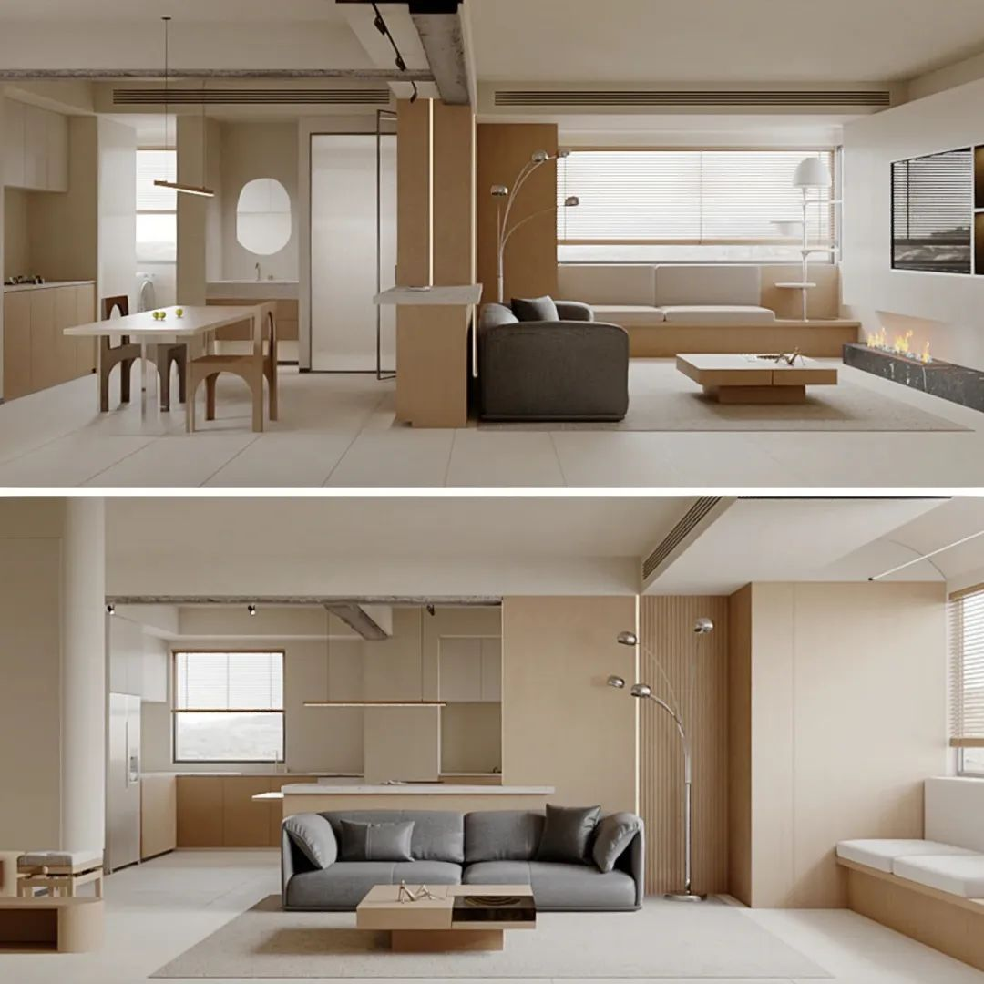 ①. 客餐廚一體化的設計:是在合理的空間布局規劃下,將開廚房、客廳與餐廳設計成敞開式,一體化的視覺可以減少壓抑感,讓空間更通透寬敞。