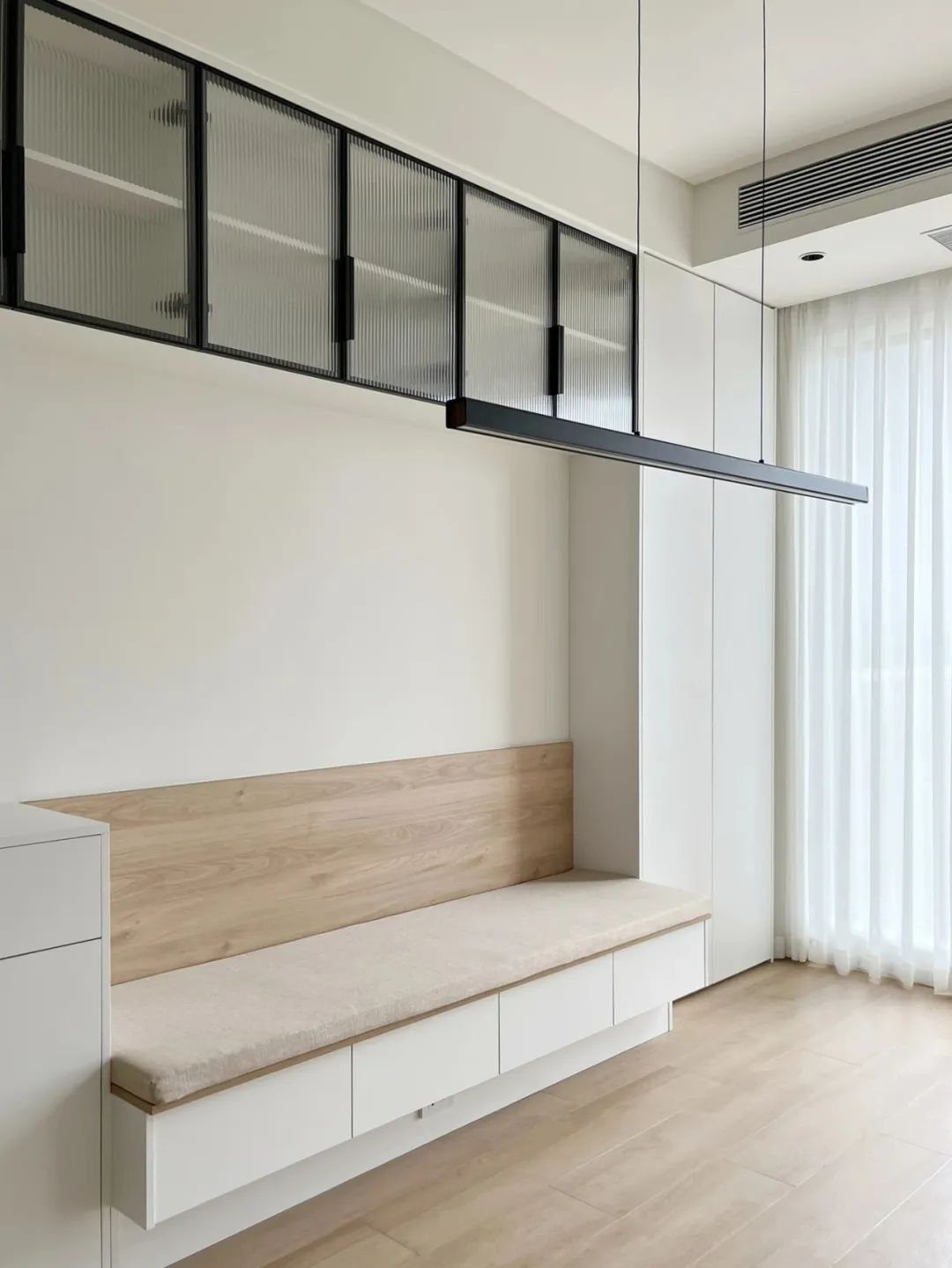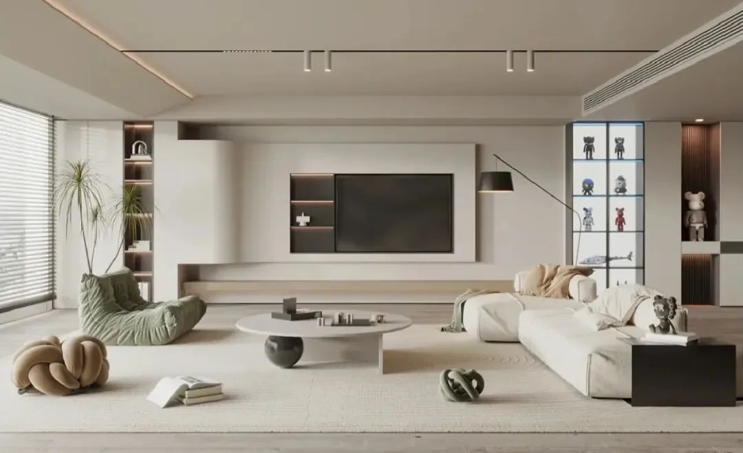 除了常規的在電視墻、過道、沙發背景這些地方,設置整面墻的通頂收納柜進行集中收納之外,也可以多做功能性的設計,比如榻榻米、壁龕、地臺、卡座等,盡可能把每一寸空間都利用起來。